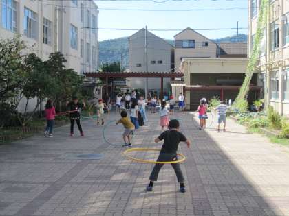 中庭では,新しく用意されたフラフープを使って子どもたちが遊んでいます。子どもたちは上手にフラフープを使えるように,楽しんで活動していました。