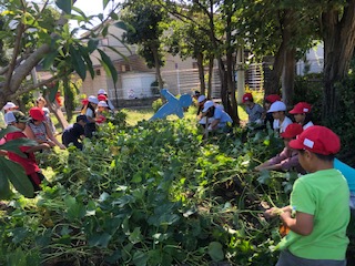 今日は,夏休み中も水やりをがんばってきた「さつまいも」の収穫を行いました。まずは,ツルをとりました。