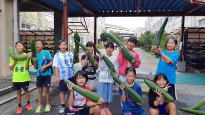 学校の北側にできていたヘチマを収穫しました。とっても大きなヘチマです。