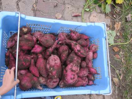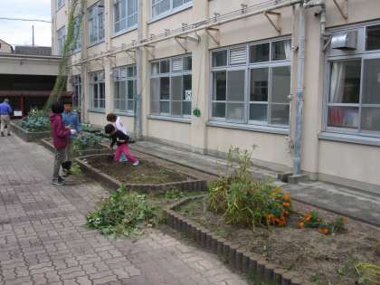 2つの花壇からたくさんのさつまいもを収穫しました。収穫した後は,花壇を耕しました。