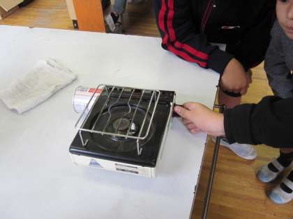 今日はアルコールランプにマッチで火をつけたり,ガスコンロにボンベを付けて火を付けたりすることをしました。