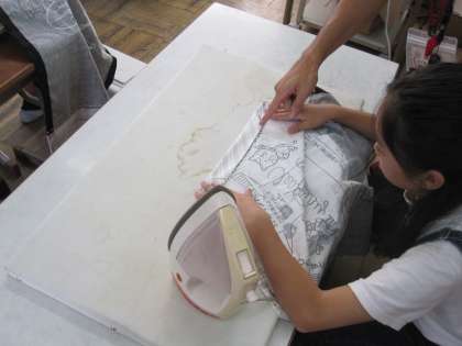 ミシンを使って,エプロンを作製しています。三つ折りしたところを丁寧に縫い進めていました。