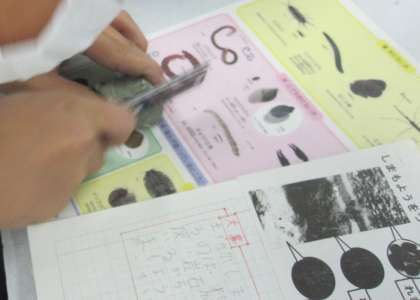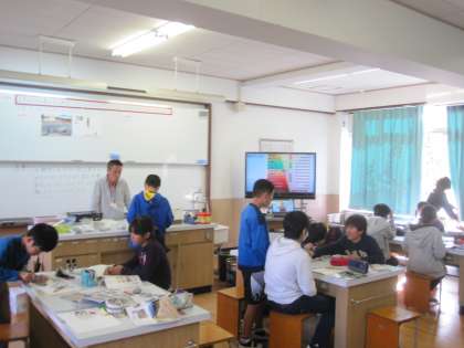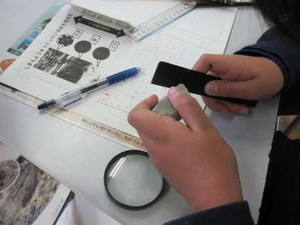 泥岩や礫岩などに触れ,粒の大きさなどを確認しました。