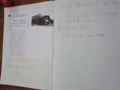 比例のグラフから読み取れることを考えました。グラフから関係の式などを考え,自分で,今日の大切なことをノートに書き留めていました。