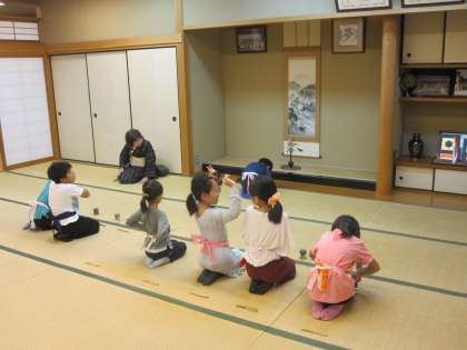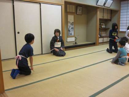 茶道体験教室では,先月より1年生も参加可能となっています。お部屋への入り方や歩き方などから学んでいます。