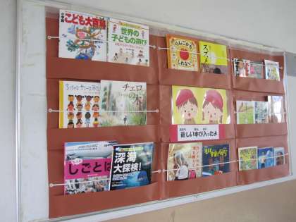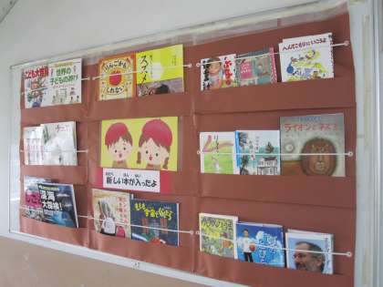 学校図書館司書による図書の掲示物です。新しい本がたくさん入りました。