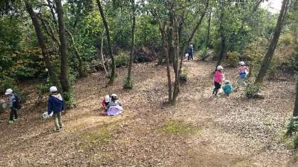 秋を見つけています。子どもたちは,木の実などを探しています。