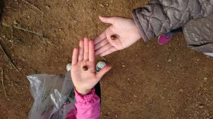 どんぐり,葉っぱ,松ぼっくりを拾っています。袋いっぱいになりそうです。