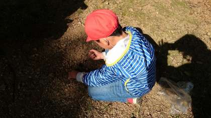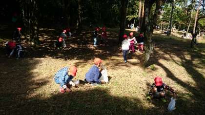 お弁当を食べ終わった子どもたちが,団栗拾いをしています。