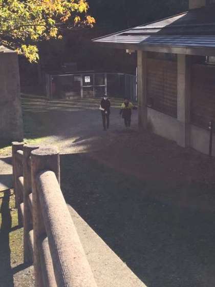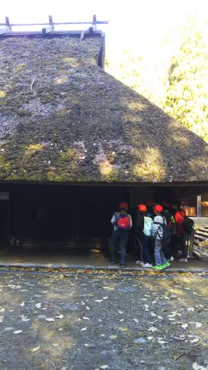 オリエンテーリングで茅葺屋根の家の前などをまわっています。