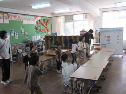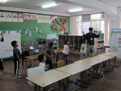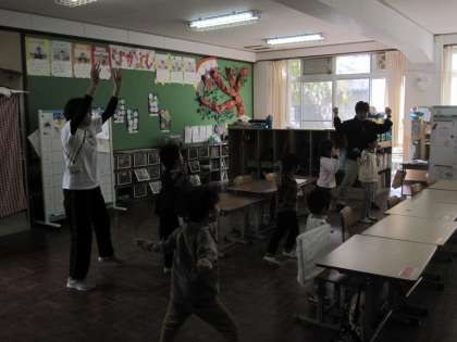 映像を見ながら,音楽に合わせて踊りました。みんな元気に踊りました。