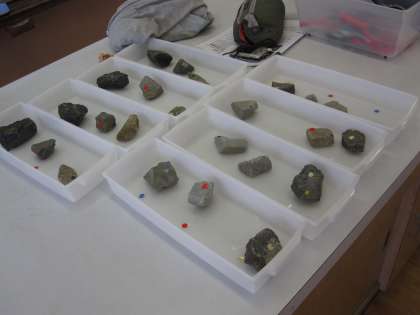 堆積してできる「泥岩・砂岩・礫岩」を観察しました。