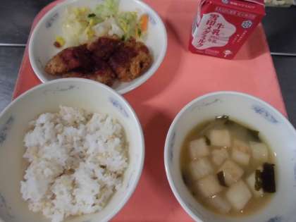 今日は、行事献立で給食感謝です。『ヒレカツ』は、給食室で1枚1枚ていねいに衣をつけた手作りのやわらかいヒレカツと、手作りのソースを味わってたべました。