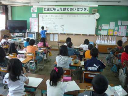 算数科の学習では,問題解決学習に取り組んでいます。教師が提示した問題を,まず子どもたちが自力解決し,次に集団討論をしてみんなで答えを導き出す学習です。最後には応用問題をし,子どもたちはその日の重要事項を振り返ります。子どもたちが生き生きと自分の考えについて説明する姿には大変感心させられます。今後も子どもたち主体の学習を継続していきたいと思います。