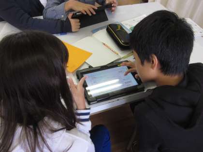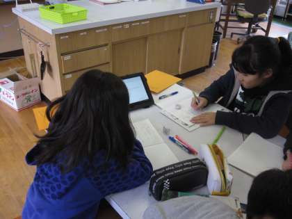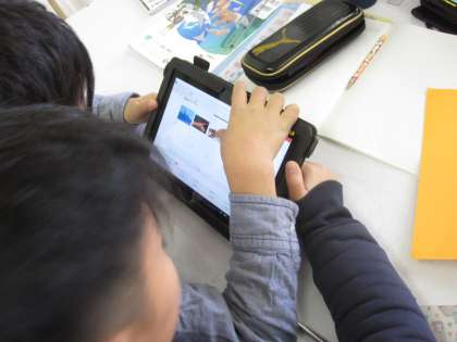 友達とタブレット端末で調べたことをもとに,話し合いながらノートにメモしたり,調べなおしたりしながら学習しました。