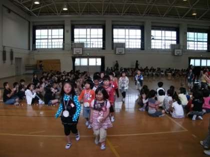 楽しかった1年生を迎える会のあっというまに時間が過ぎました。1年生の退場です。これからも梅津北小学校の友達をたくさんつくってください。