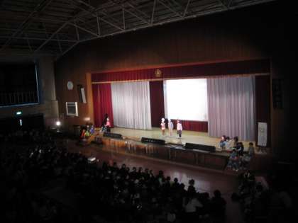 1年生の劇『むかしばなしがいっぱい」が行われました。たくさんの人が見る体育館の舞台で,頑張って発表していました。
