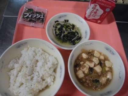 子どもたちから、「『マーボどうふ』は、甘辛くてお肉に味がしみていて、美味しかったです。『ほうれん草ともやしのいためナムル』は、ほうれん草ともやしがマッチしていて、美味しかったです。」と、感想をくれました。