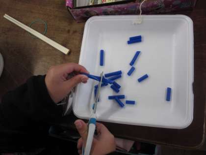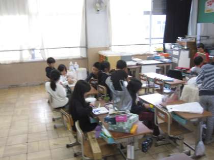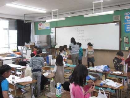 空き箱や空き缶などを使っておもちゃづくりをしています。ためしてみて,動かして,考えながら作っています。