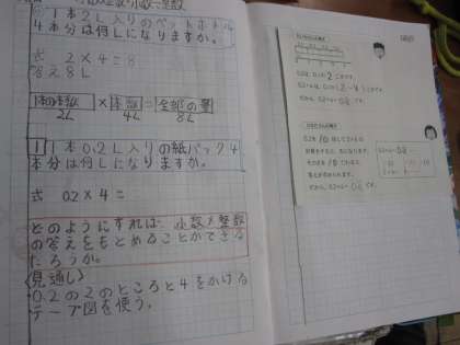 小数×整数の考え方について,学習をしました。0.2×4はどのようにして求めるのかを学級で確かめながら,考えを深めました。