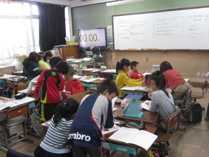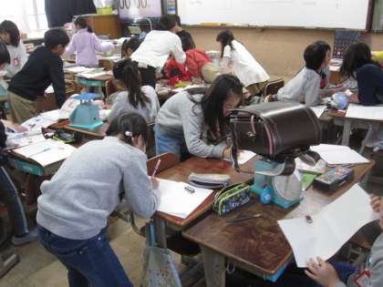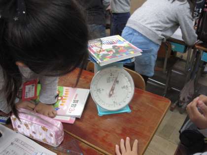 目盛りをどのように読んだらよいかを考えながら,ランドセルやクーピーなど測りました。