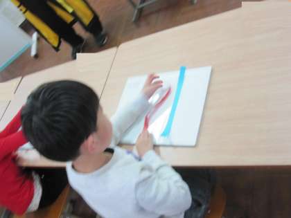 青と赤とどちらが長いのかを考えました。折れ曲がっている赤の方をどのようにして,比べるのかを一人一人考えました。
