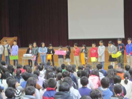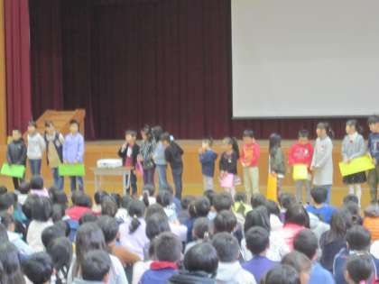 3組,6年,・・・と順番に発表していき,各学級で決めた理由なども伝えながら,標語の発表が行われました。