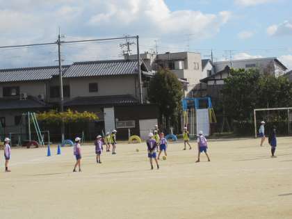 サッカーの学習をしています。チームで自分たちの作戦を試しながら練習をしています。