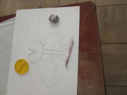 下絵で考えた生き物をはさみで切っていきました。