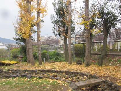 北門の近くのイチョウの木が,冬をむかえて,葉が散ってきています。イチョウの葉で下は黄色いじゅうたんのようになっています。