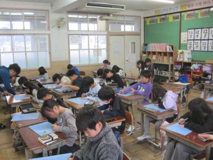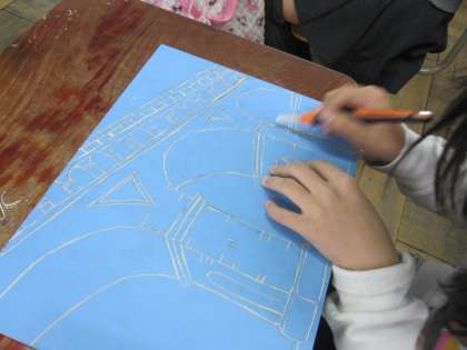 線の上を彫り進めていますが,深く彫ることには苦戦しているようです。深さを確かめながら,子どもたちは彫り進めています。