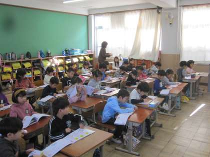 漢字テストの前に,1年生の子どもたちはドリルで確認しています。