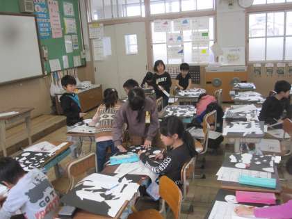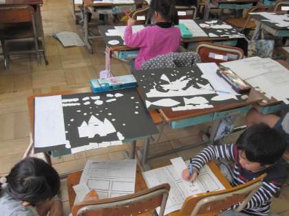 ハサミで切って貼り合わせた作品の鑑賞カードを書いて,お互いに鑑賞しました。