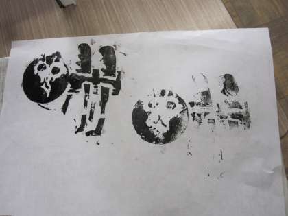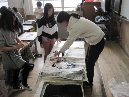 作った生き物をどこに配置するかを考えながら,子どもたちは版を刷っていました。