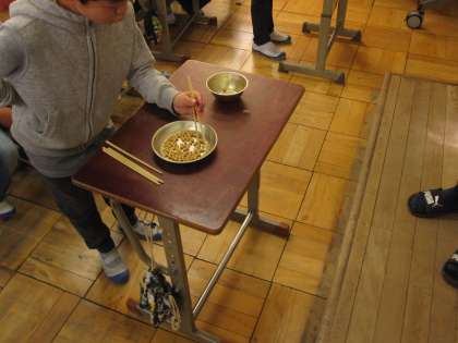 給食週間になりました。クラスで豆つまみの練習を行いました。一粒つかむのも難しそうです。