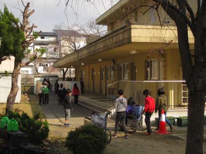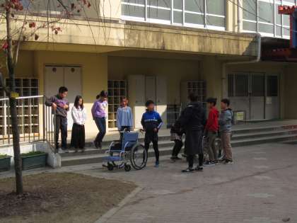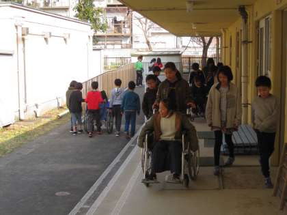 車いすに乗ったり,車いすを押したりする体験をしました。車いすでの難しさや困りを知って,学習を深めていきます。