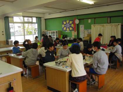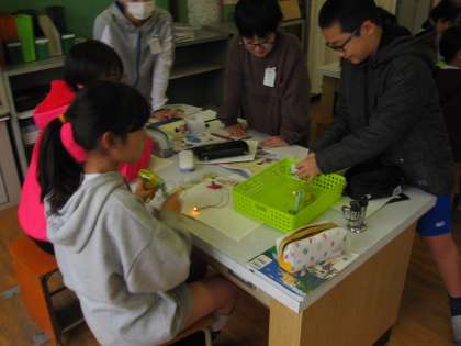 手回し発電機を使って,豆電球や発光ダイオードに明かりをつけるときの様子について調べました。