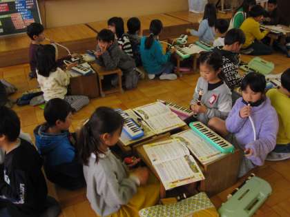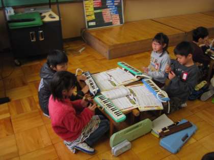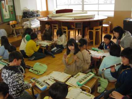 グループで音を聞き合いながら,練習を進めています。