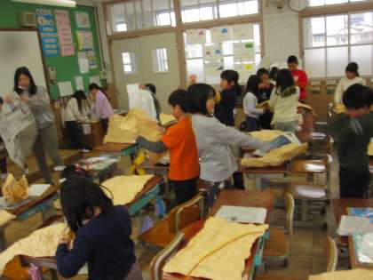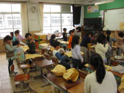 紙を使っての工作に取り組んでいます。今日は,まず,紙をくしゃくしゃにして,その感触をしっかりとつかみました。
