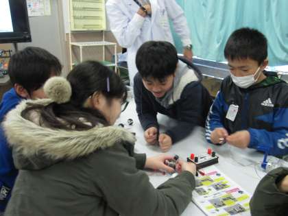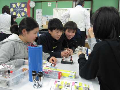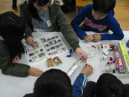 作ったコンデンサを使い,手回し発電機で電気をためて,実際に電気がためられているかを確かめました。
