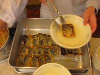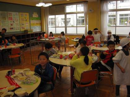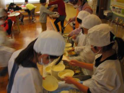 今日はスチームコンベクションオーブンメニューの「西京焼き」でした。子どもたちは慣れない食缶をしっかりともって運び,魚を一匹一匹丁寧に配膳していました。