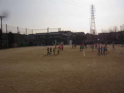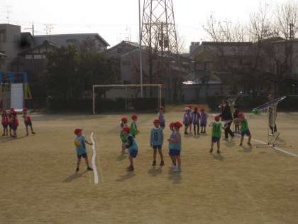 パスゲームを行いました。子どもたちはゲームをする前に,グループでゴールに入れる練習をしました。