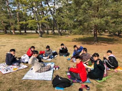 御所チェックポイントです。早い班は、お昼を食べ始めています。みんな元気です!