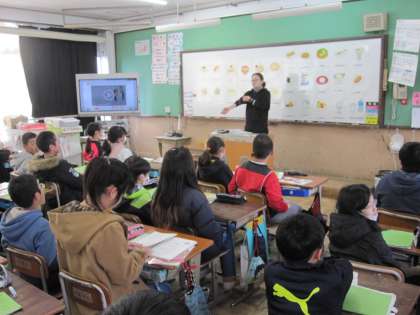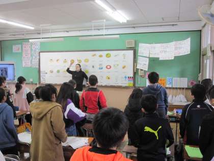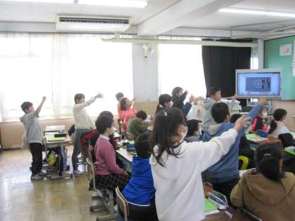外国語活動を始めるときに毎回,挨拶をして始めています。英語でじゃんけんをして,今日の曜日など,先生の質問に答えています。