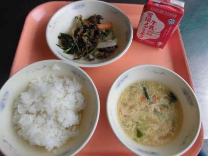 『中華コーンスープ』は、チキンスープで玉ねぎ・人参・クリームコーンを煮、塩・醤油で調味し、水溶き片栗粉を流し入れて、割りほぐした卵を流し込み、チンゲン菜を加えて仕上げました。