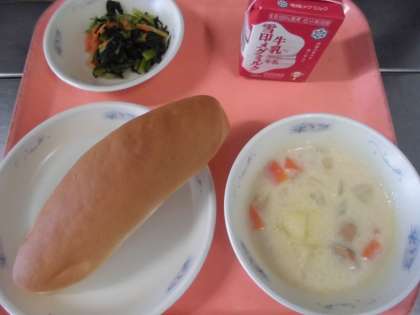 子どもたちから,「『じゃがいものクリームシチュー』は,パンともよく合って,とっても美味しかったです。『小松菜のソテー』は,小松菜がシャキシャキしていて,人参がやわらかくて,食べやすくておいしかったです。」と,感想をくれました。