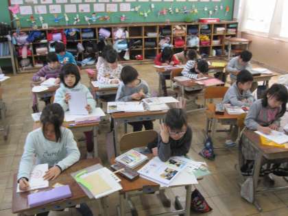 友達から発表のアドバイスを受けてより良くしたり,思い出アルバムを見直して追記したりしながら,取り組んでいました。