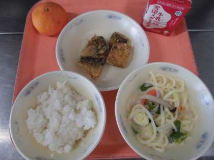 子どもたちから,「『あじのこはくあげ』は,カリッとしていて,ご飯によく合っておいしかったです。『豆乳鍋(うどん入り)』は,野菜に豆乳がしみていてとても甘くて美味しかったです」と,感想をくれました。゜