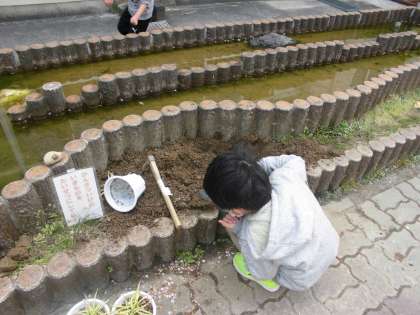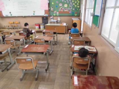 外に出ると比較的穏やかな気候に感じます。教室では,座席の間隔をあけて,読書や課題に取り組んでいます。休憩時間に池の周りの土を掘ってみると,ダンゴムシを見つけました。