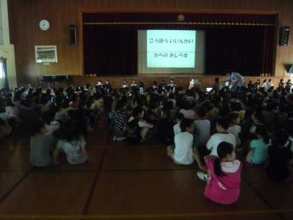 6月6日(月)に児童朝会を行いました。広報委員会の子どもたちが,司会を勤め4月から来られた先生方のクイズをして盛り上がっていました。